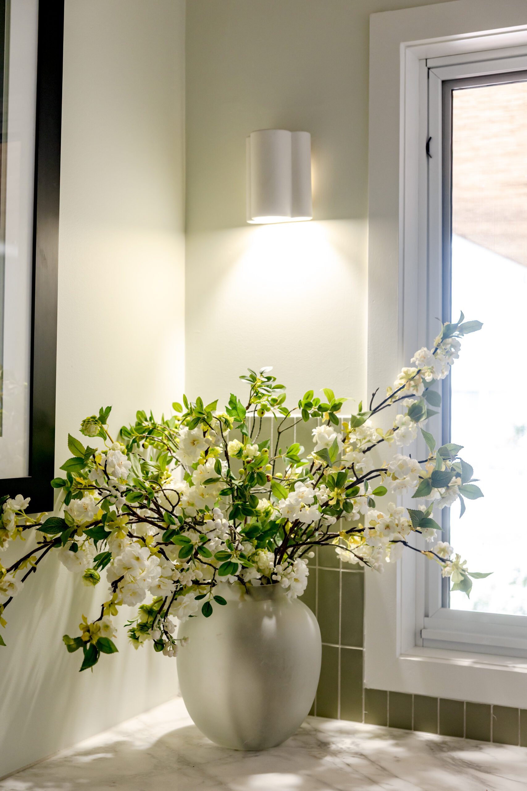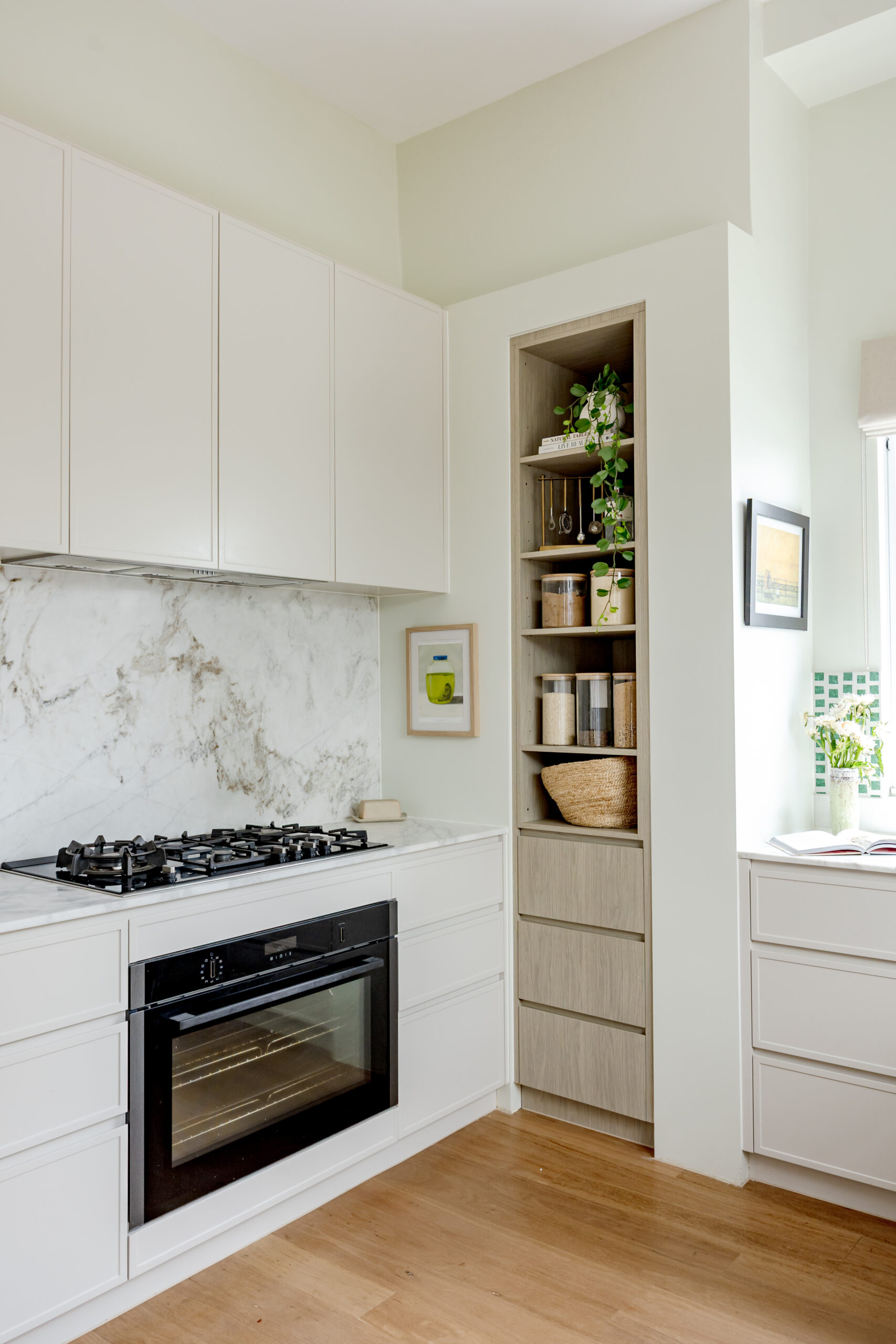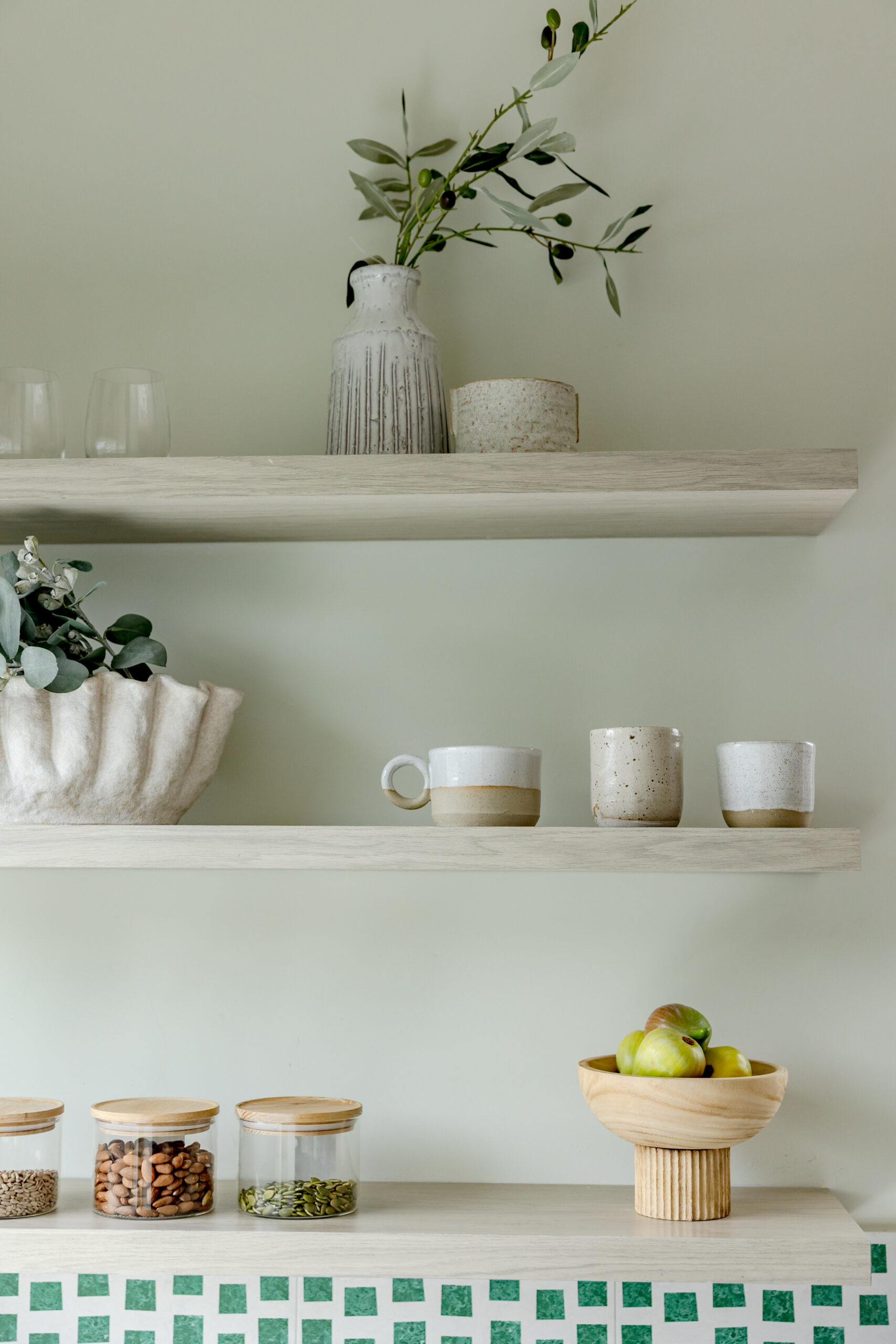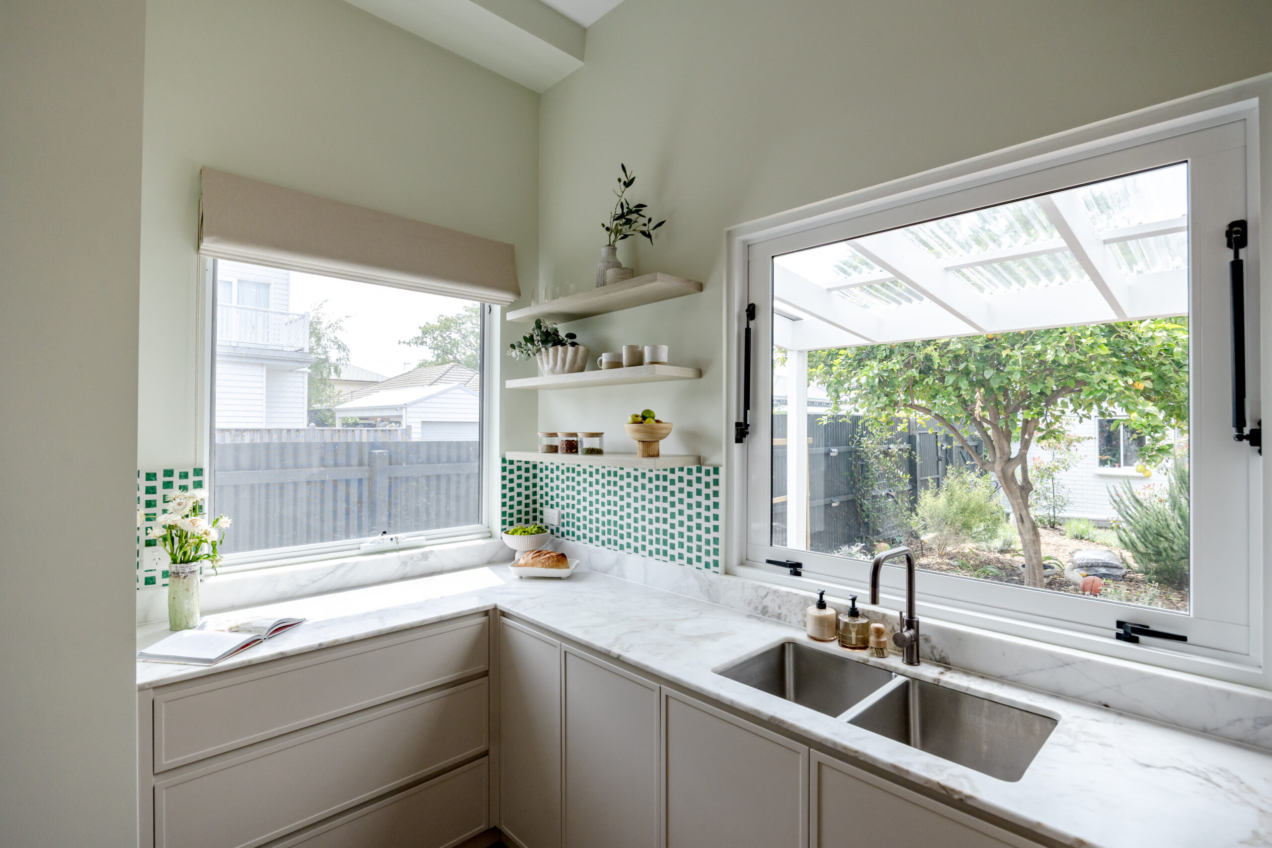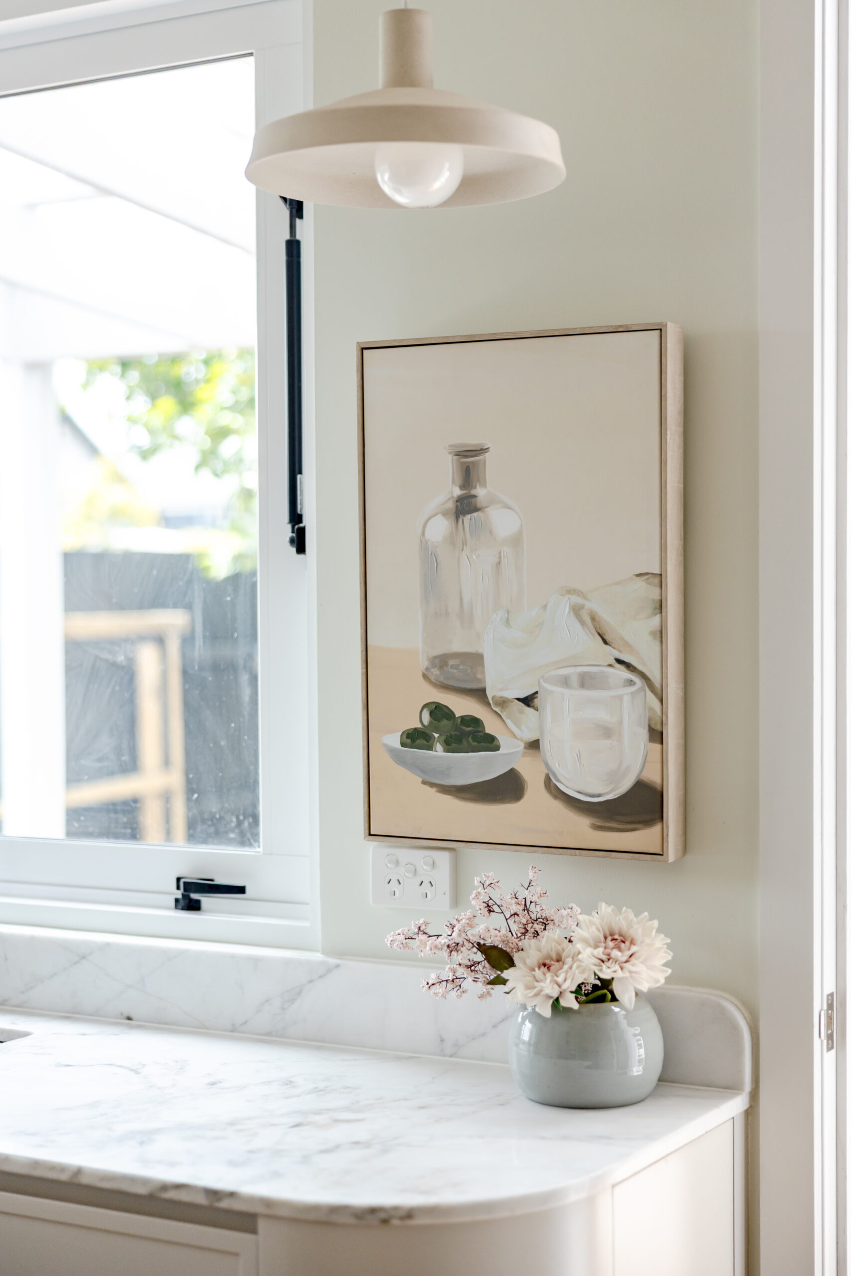 Their brief emphasised a neutral foundation layered with warmth, gentle colour, and moments of personality. Warm whites, soft greens, and touches of yellow guided the palette, while subtle textures and natural materials helped maintain a sense of calm and simplicity. It was equally important to retain some of the home’s existing character, allowing modern functionality to harmonise with the charm of the original architecture.