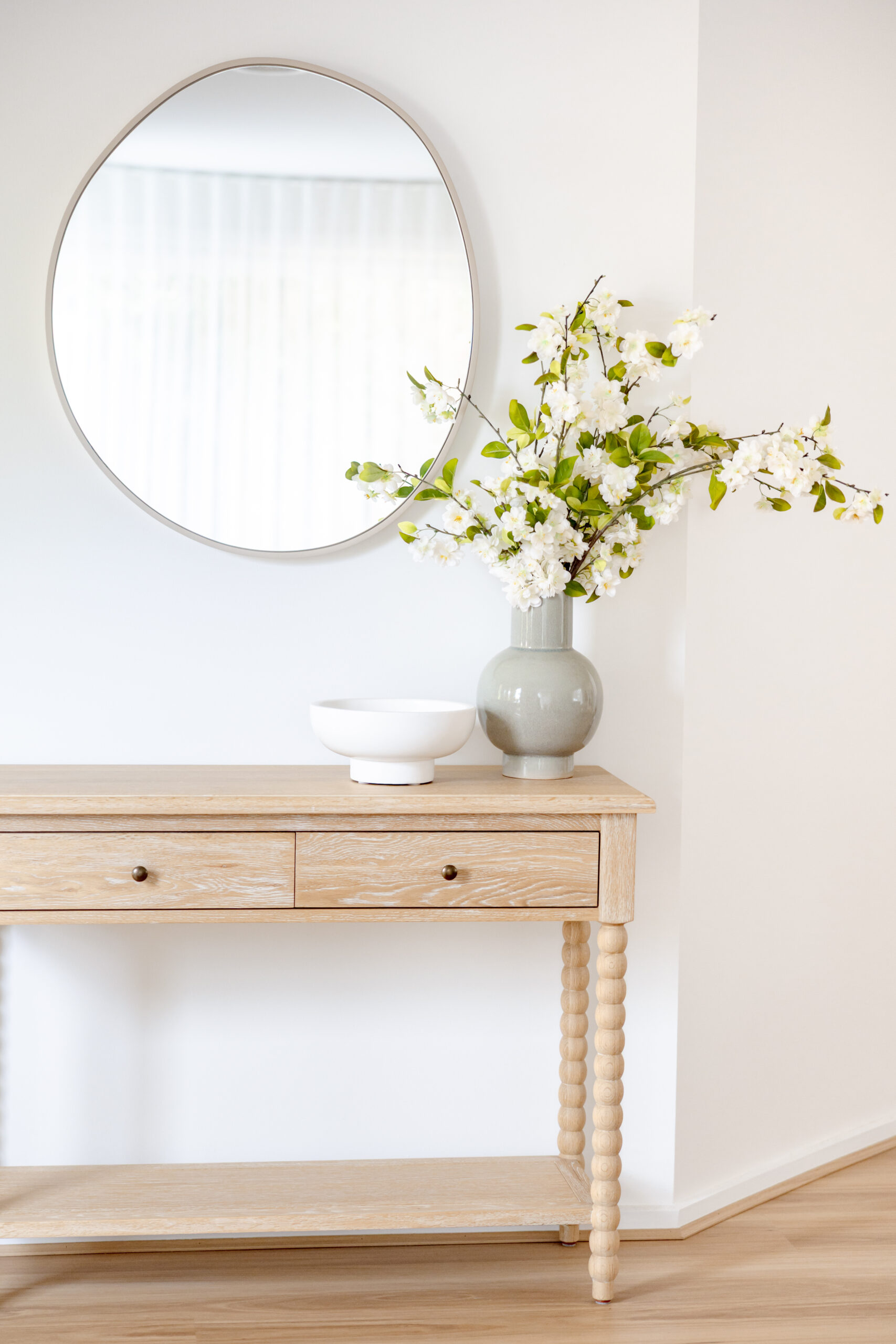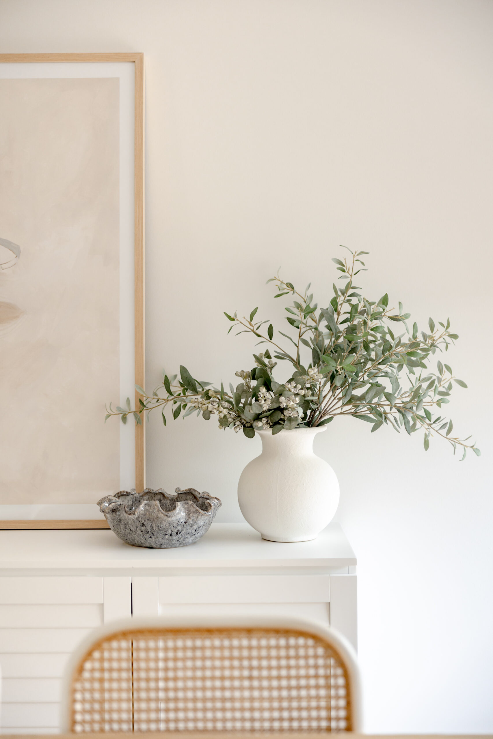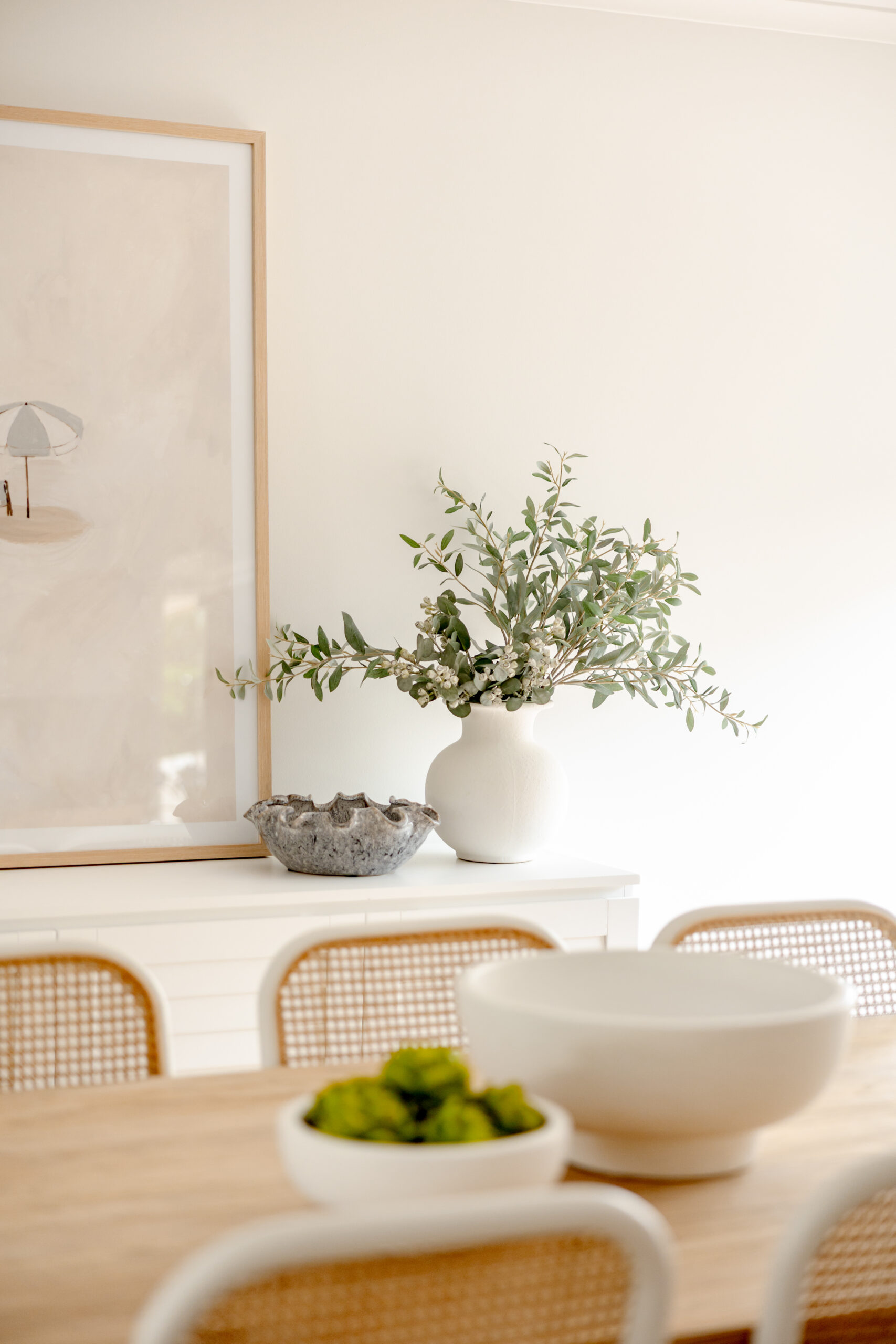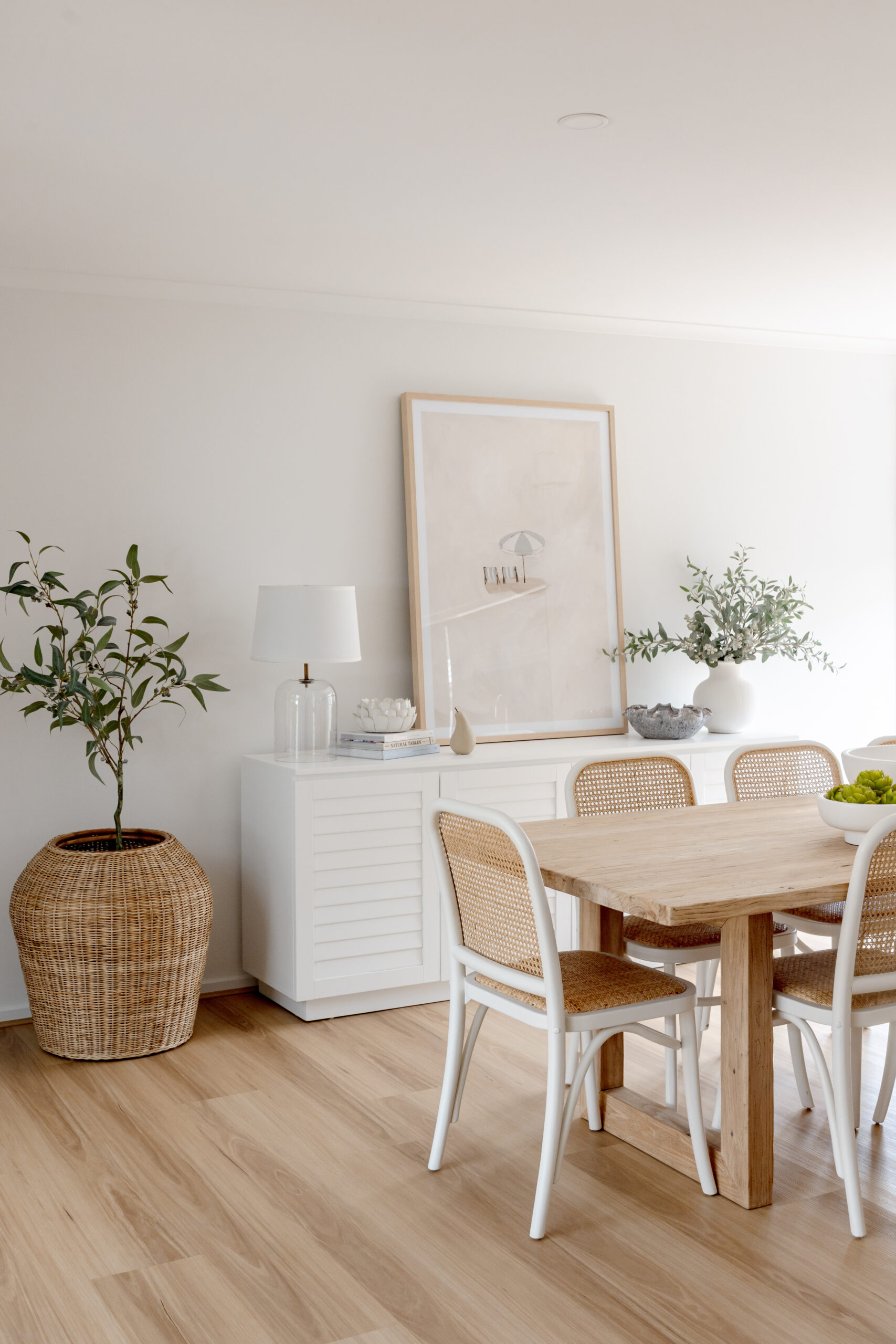The design approach centred around creating an atmosphere of ease and tranquillity. By layering warm neutrals, gentle coastal accents, and clean contemporary lines, the spaces now feel both refined and relaxed. Light-washed timbers, woven textures, and subtle tonal variations add depth without overwhelming the serene palette, while carefully chosen décor pieces bring softness and a sense of considered simplicity.